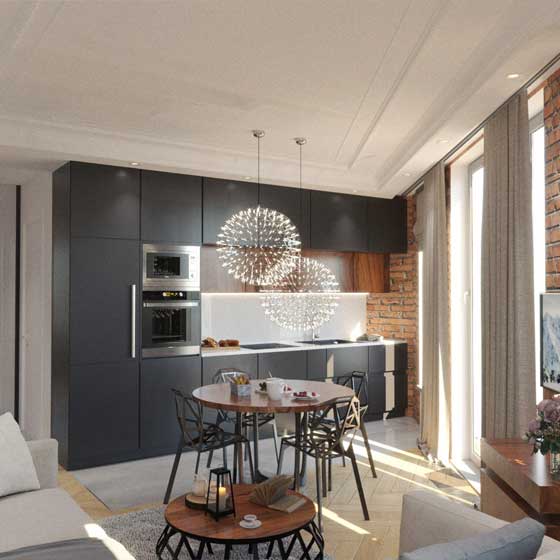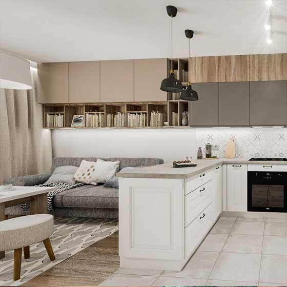 Projektując i wykańczając kuchnie staramy się zorientować na potrzeby użytkowników. Uwzględniamy funkcjonalność trójkąta roboczego, dobieramy produkty i materiały wysokiej klasy i znanych marek. Co więcej, projektowane i wykańczane przez nas kuchnie na wymiar łączą ergonomię z pięknem! Nasza usługa “wchodzisz i mieszkasz” oznacza wnętrza gotowe do zamieszkania!