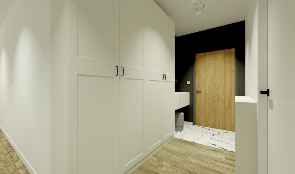 Mieszkanie zlokalizowane w inwestycji Lublańska Park dewelopera Wawel Service liczy 67 mkw. i składa się z trzech niezależnych pokoi, połączonych korytarzem. Dla klienta istotne było, aby całą usługę projektowania, wykończenia i wyposażenia mieszkania móc powierzyć jednej firmie. Równie istotne były kwestie finansowe. Dlatego, aby sprostać możliwościom finansowym inwestora zaproponowano wyłącznie część mebli wykonywanych na wymiar. Pozostałe wyposażenie to produkty gotowe m.in.: z Ikea. Niemniej mieszkanie zostało zaprojektowane , rozrysowane i zwizualizowane, aby zaprezentować efekt finalny wnętrza gotowego do zamieszkania. Następnym krokiem współpracy z SaniWell jest usługa wykończenia, pełnego umeblowania i wyposażenia.