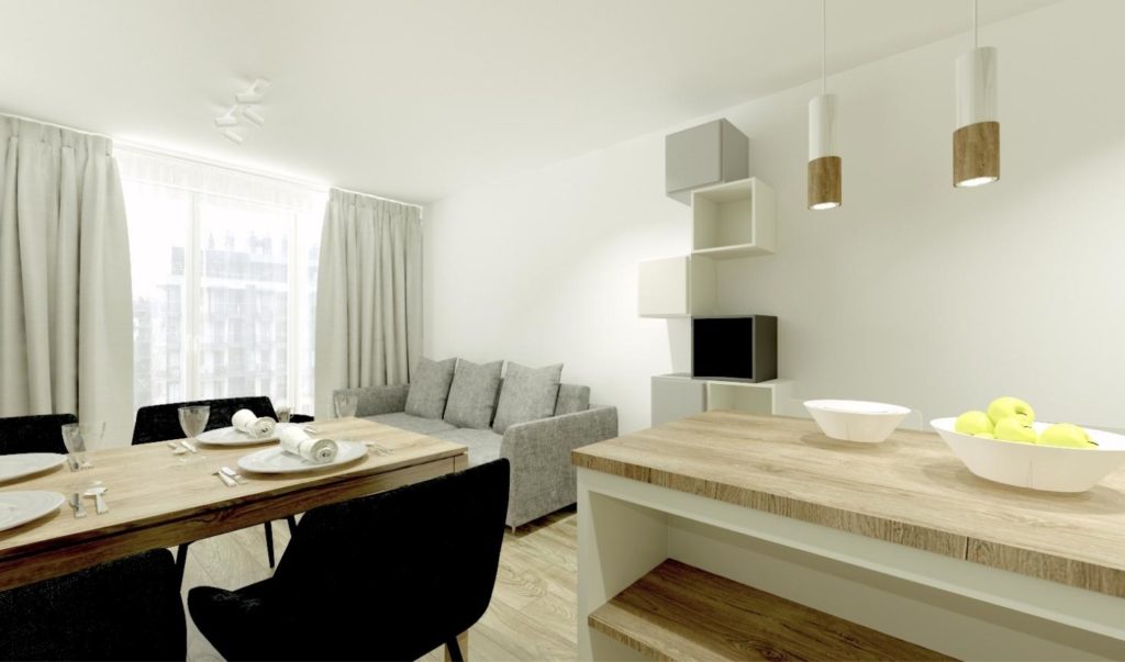Salon połączony z aneksem kuchennym jest sercem tego mieszkania. Na etapie projektowym uwzględniono nie tylko przestrzeń do gotowania i magazynowanie, ale również przestrzeń jadalnianą i rozrywkową. Pełna zabudowa kuchenna w jasnym odcieniu nadaje wykończonemu pomieszczeniu lekkości. Wykończone pod klucz w standardzie „wchodzisz i mieszkasz” obejmuje pełne wyposażenie i umeblowanie wnętrza, z uwzględnieniem telewizora i szafki RTV, klimatyzacji i drobnych dekoracji.