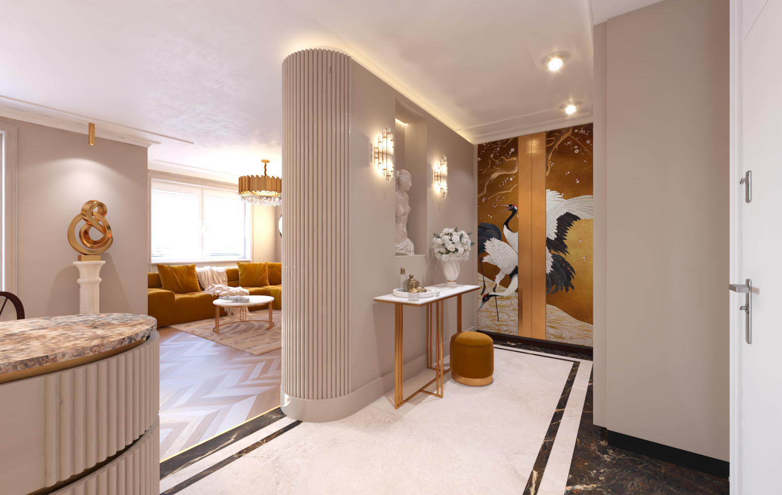 Projektując, a następnie wykańczając mieszkanie pod klucz, zadbano o najdrobniejszy detal, który uczynił to wnętrze wyjątkowym i pięknym. Stylowa podłoga w jodełkę, dekoracyjne wykończenie ścian, prestiżowa zabudowa kominka czy szklane drzwi oddzielające salon od sypialni. Dlatego każdy z dobranych elementów wyposażenia i materiałów wykończenia sprawia, że mieszkanie odbierane jest jako wnętrze luksusowe i eleganckie. Warto zwrócić uwagę na ozdobne wykończenie szafy w przedpokoju, które przyozdobiono grafiką.