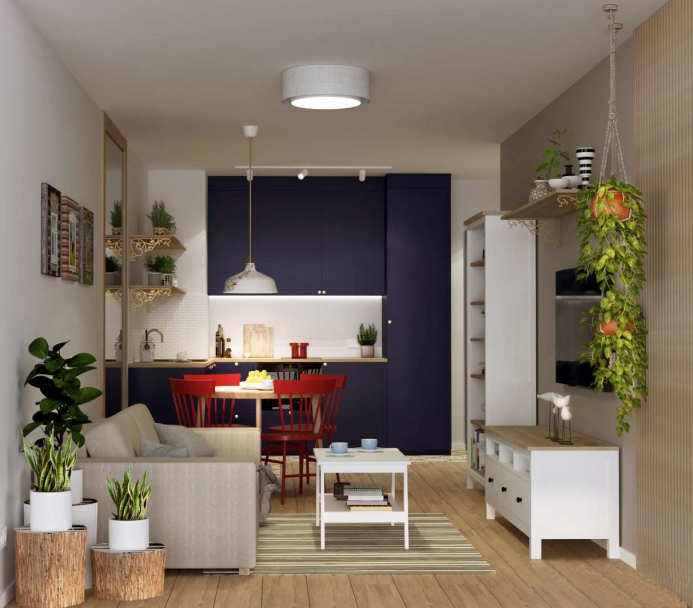 Poniżej prezentujemy galerię wizualizacji kolejnego mieszkania. Prace niebawem dobiegną końca i oddane wnętrze będzie gotowe do zamieszkania. Dwupokojowe mieszkanie zlokalizowane jest w okolicach krakowskiej Olszy i składa się z salonu z kuchennym aneksem, osobnej sypialni, łazienki i przedpokoju. Mieszkanie zaprojektowano w duchu modnego stylu boho, który łączy w sobie naturalność i egzotykę z eklektyzmem i elementami etnicznymi. Dlatego kolory i kwieciste wzory są obecne w całym mieszkaniu. Zastosowanie pełnowymiarowego lustra w salonie sprawia, że pomieszczenie jest większe optycznie. Czerwone krzesła w oryginalny sposób przełamują stonowaną paletę kolorystyczną. Takie detale jak makramowe kwietniki, drewniane lamele czy wisząca lampa z kwiecistym wzorem składają się na folklorystyczny charakter salonu.