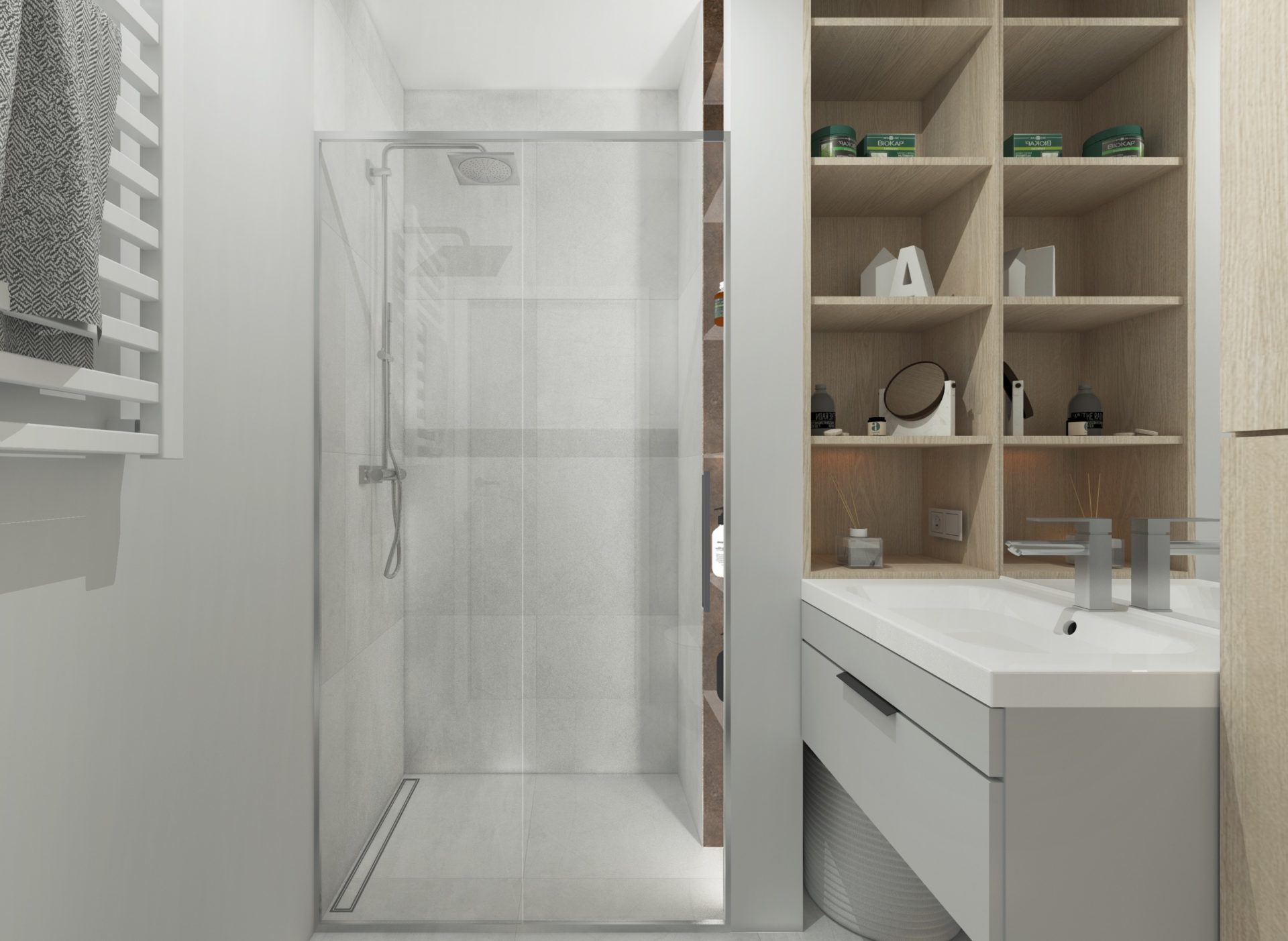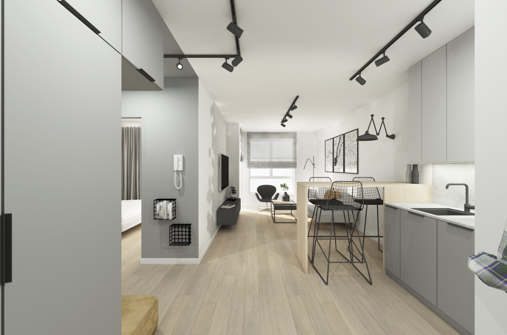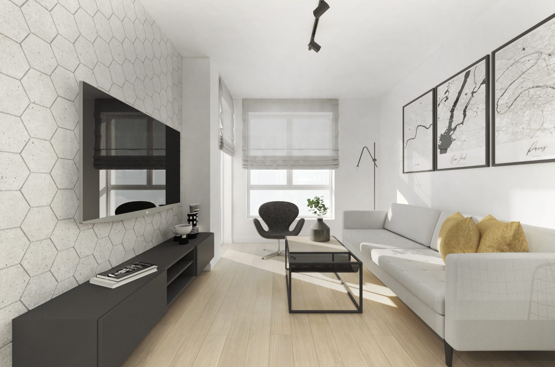 W przedstawionym wnętrzu zastosowano stonowaną skalę szarości i bieli, uzupełnioną o detale w kolorze czarnym, które nadały mieszkaniu industrialnego wymiaru. Przesuwne drzwi na prowadnicy, łączą minimalistyczny salon z sypialnią.
