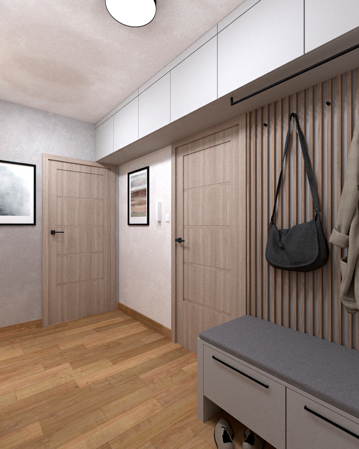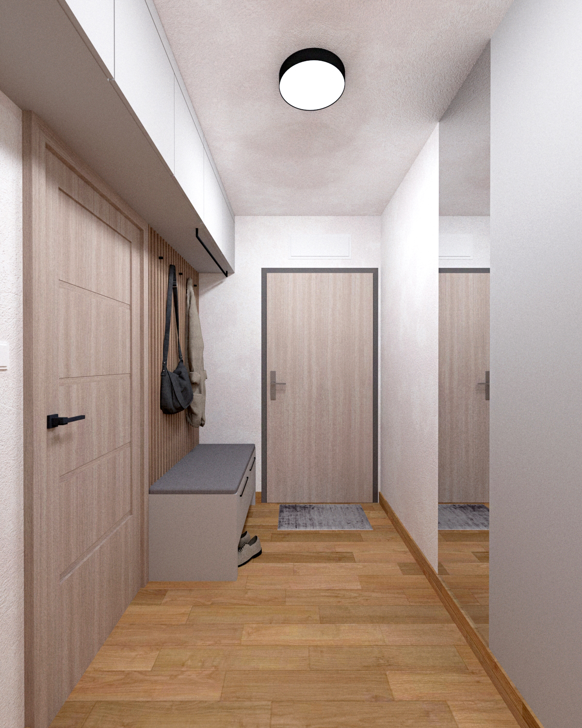 Mieszkania wykonywane w oparciu o pakiet Komfort wraz z dodatkowymi meblami na wymiar: kuchnia ze sprzętem AGD i szafa w zabudowie