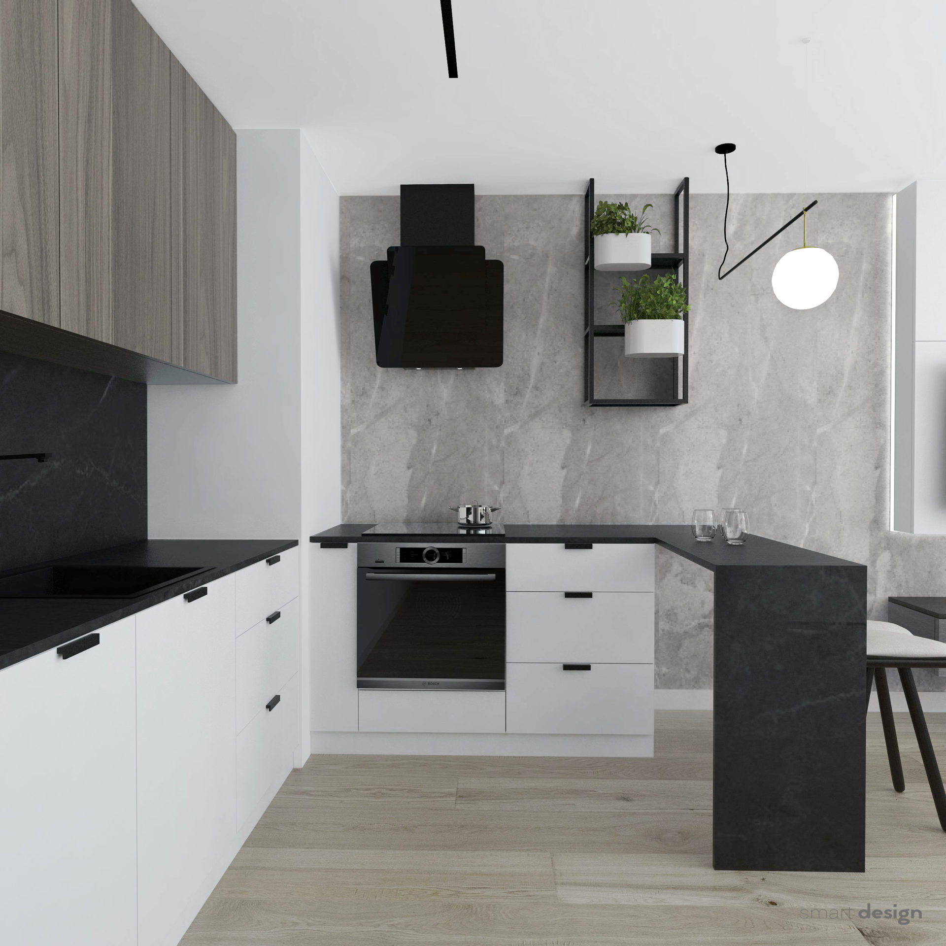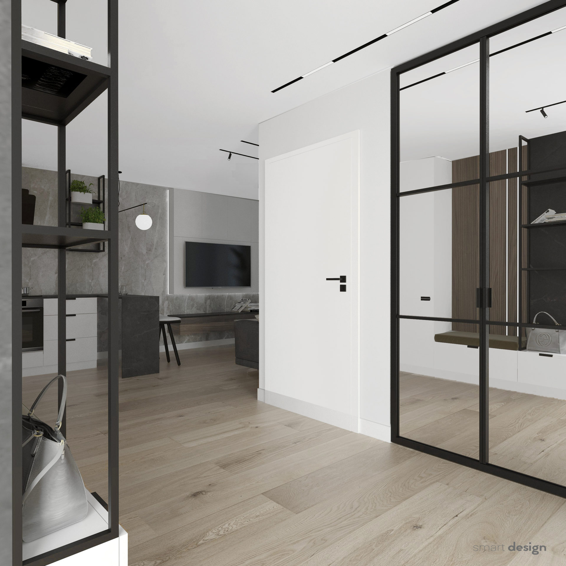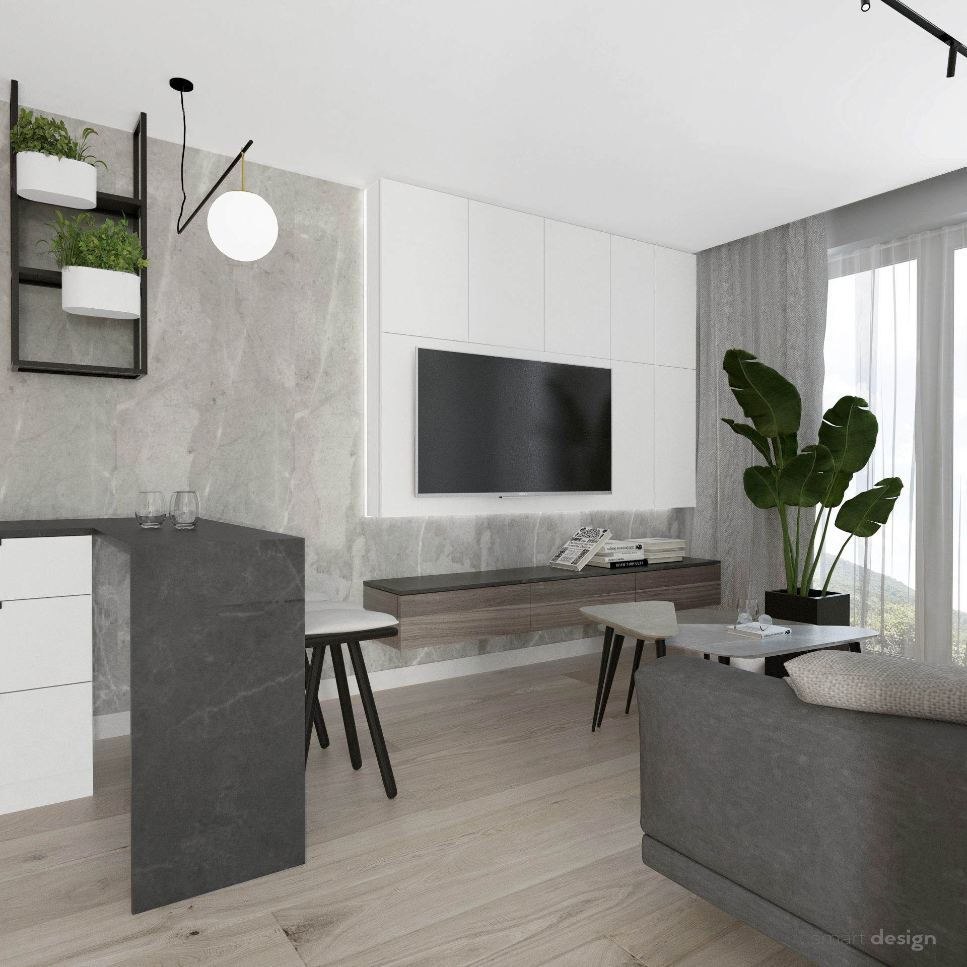 W prezentowanym mieszkaniu zastosowaliśmy wielkoformatowe spieki kwarcowe, specjalna winylową podłogę na podłożu korkowym, wypalany grafitowy blat, meble w okleinie naturalnej i lakierze. Klimatyzację, chowane w sufit oświetlenie i ogrzewanie wnętrza spięliśmy w jeden spójny system inteligentnego domu sterowany przez firmę Grenton. Wszystkie zastosowane rozwiązania sprawiają, że mieszkanie należy do najefektywniejszych i zarazem najdroższych, jakie wykonywaliśmy.